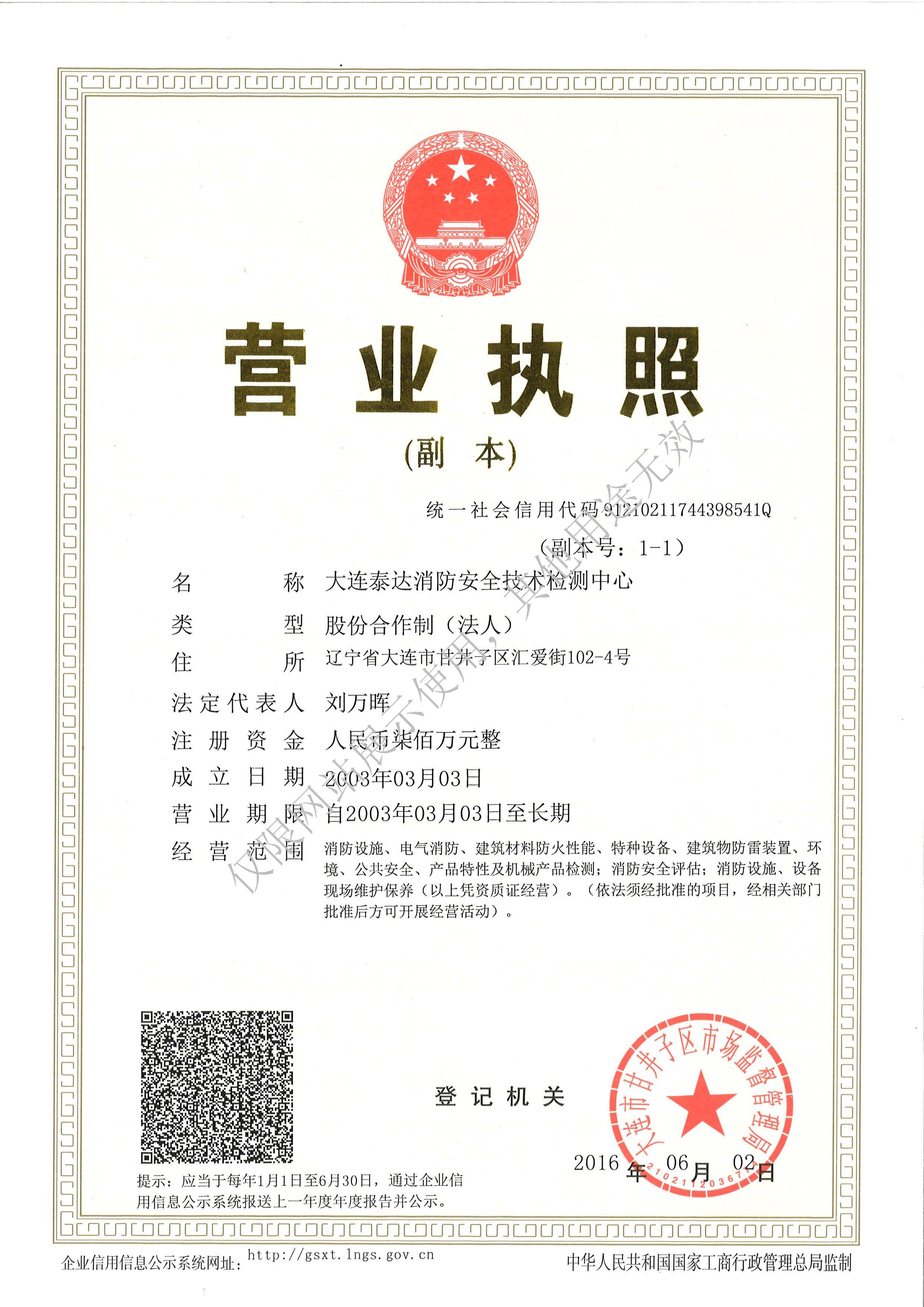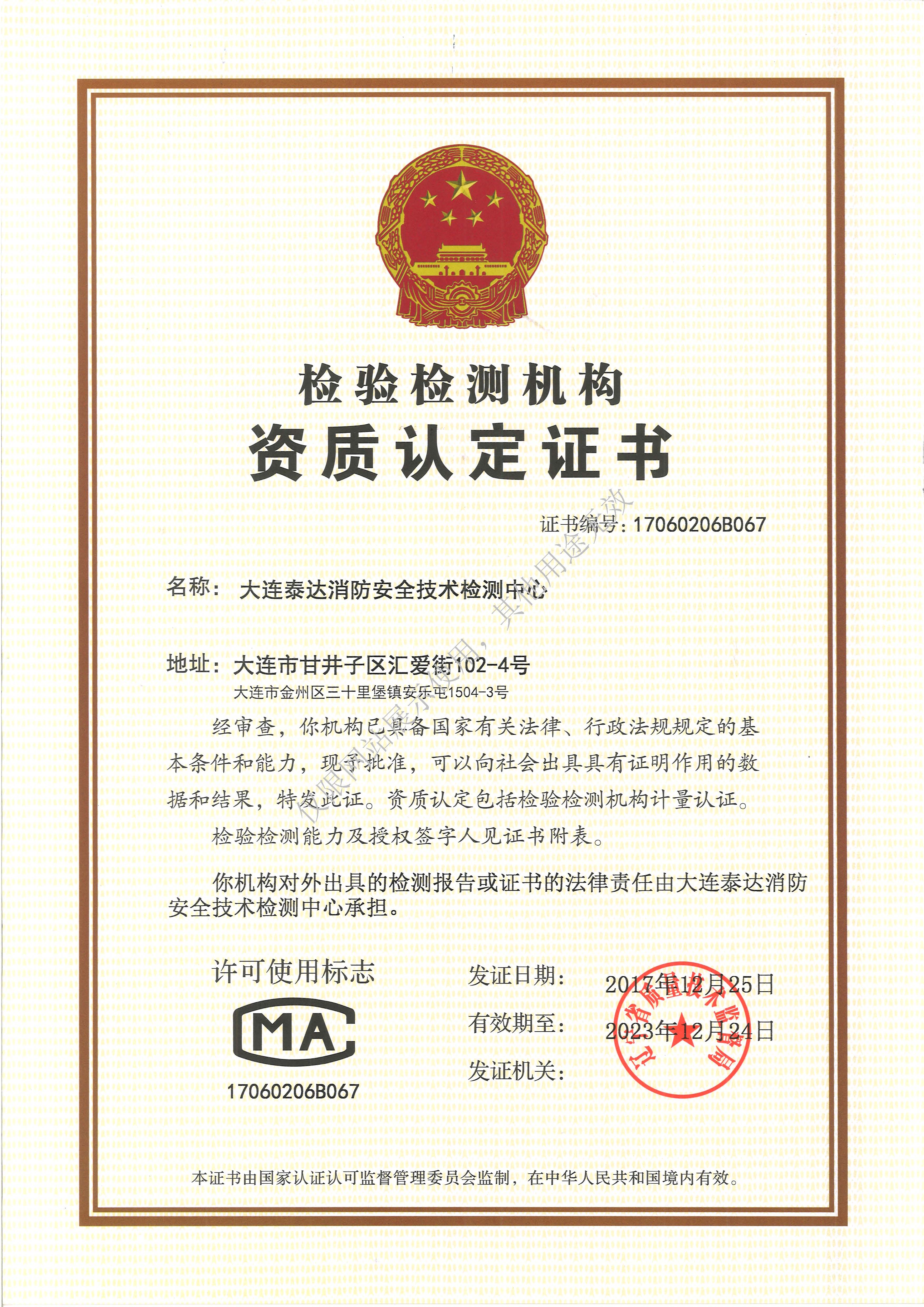 · 是經“社會消防技術服務信息系統”備案并公示的消防技術服務機構,已取得中國氣象局頒發的雷電防護裝置檢測資質證書、遼寧省質量技術監督局審核批準的檢驗檢測機構資質認定證書(CMA)及包括消防檢測、電氣檢測、雷電防護裝置檢測、防火涂層厚度檢測等在內的200余項檢驗檢測能力,取得大連市應急管理局頒發的安全生產標準化證書,獲得質量管理體系、環境管理體系、職業健康安全管理體系認證證書,是經備案的高新技術企業,可獨立出具具有證明作用的檢測報告。
